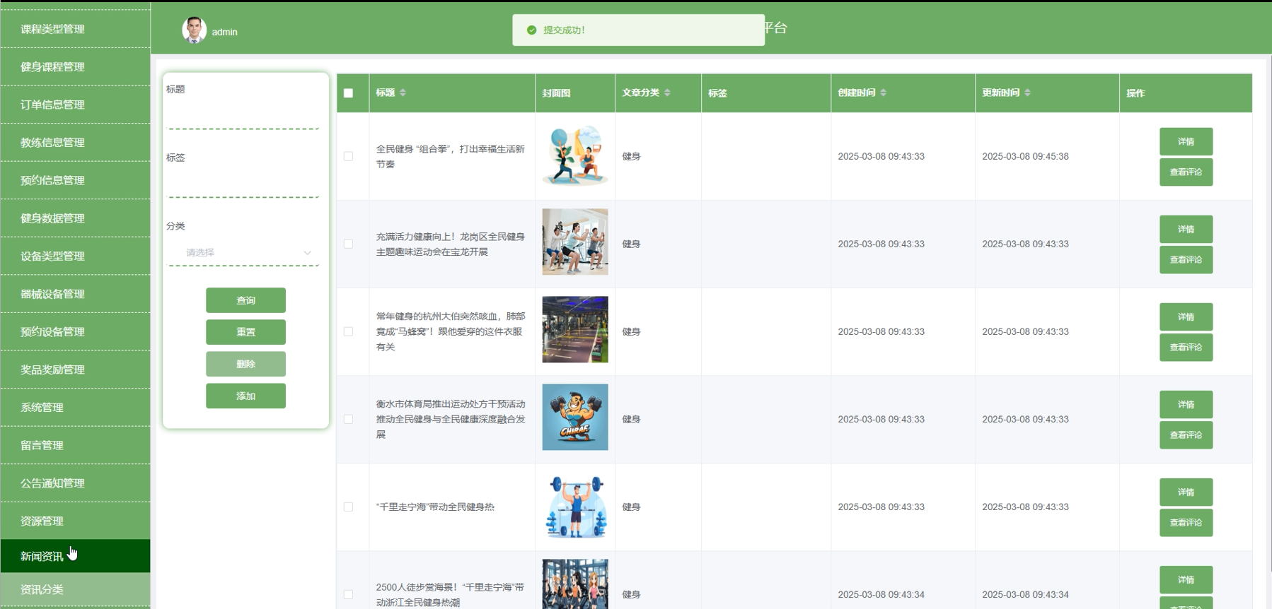- 健身课程管理:管理员可以对所有健身课程进行管理,如新增、删除、修改课程信息,确保课程内容的丰富性与时效性。