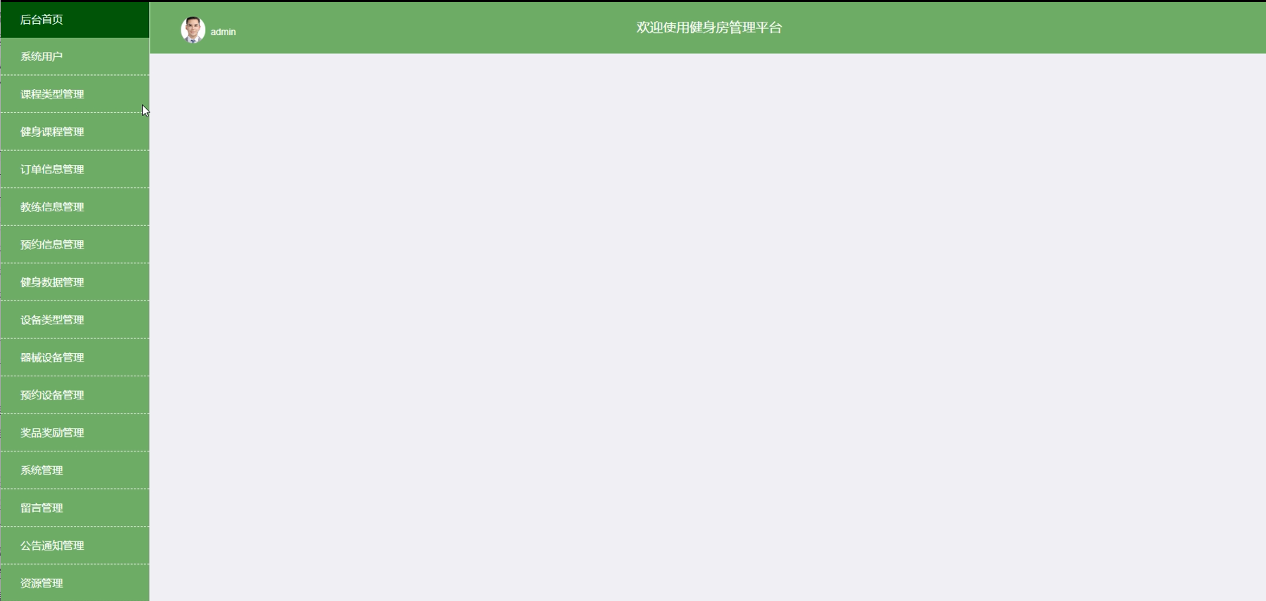 管理员首页界面作为系统管理的核心入口,提供系统用户管理、课程类型管理、健身课程管理、订单信息管理、教练信息管理、预约信息管理、健身数据管理、设备类型管理、器械设备管理、预约设备管理、奖品奖励管理、系统管理、留言管理、公告通知管理和资源管理等功能。管理员可通过首页快速查看平台运营状态、管理用户信息、维护课程与设备资源,并处理订单、预约、留言及系统公告,确保健身房平台的高效运营和服务质量的提升。如下图所示。