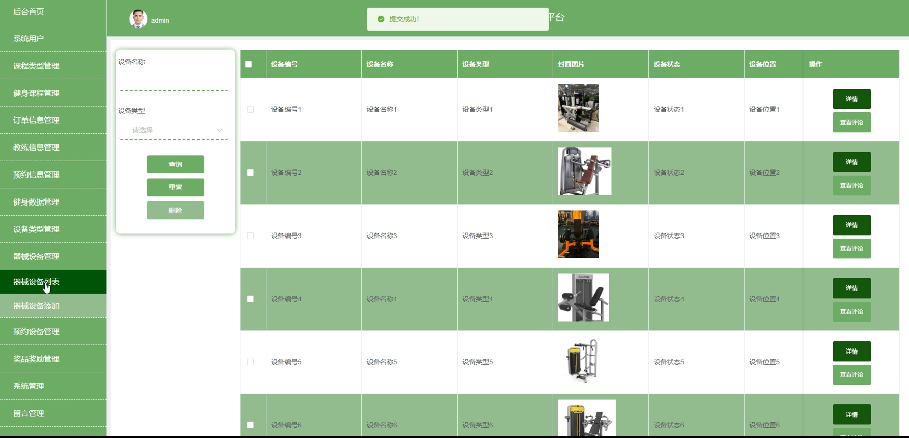 - 设备类型管理:管理员可以定义和管理健身器械的类别,确保设备的清晰分类和管理。