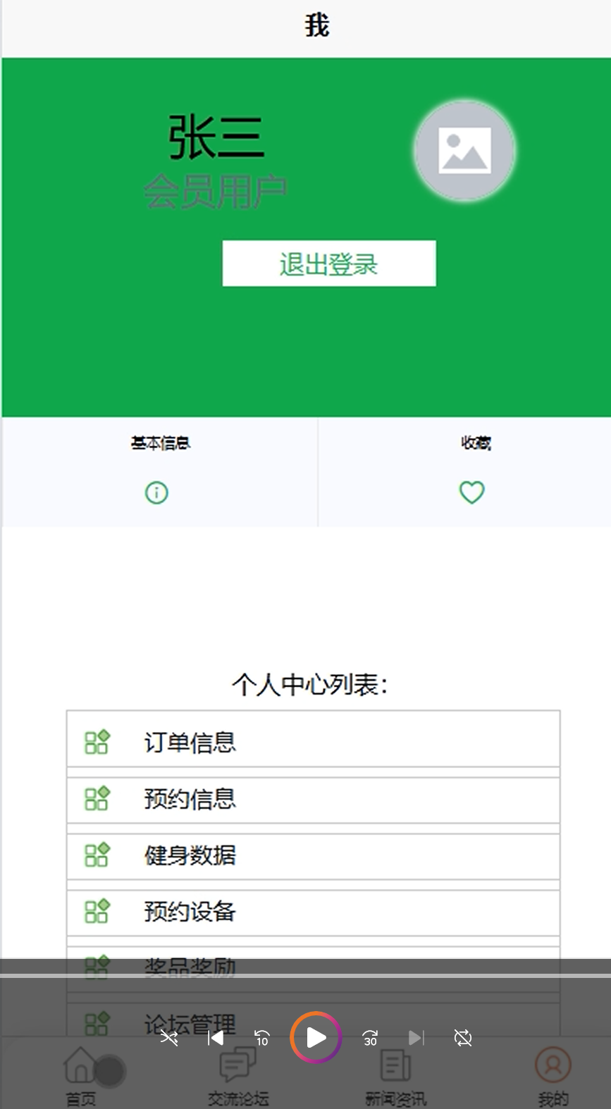 会员用户个人中心界面提供订单信息、预约记录、健身数据、设备预约、奖品奖励、论坛管理等功能,方便用户管理个人信息和健身相关事务。界面如下图所示。
