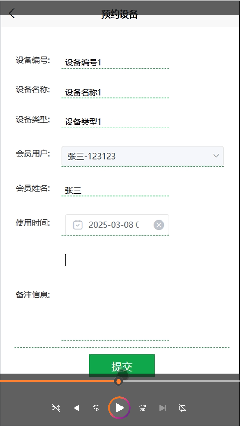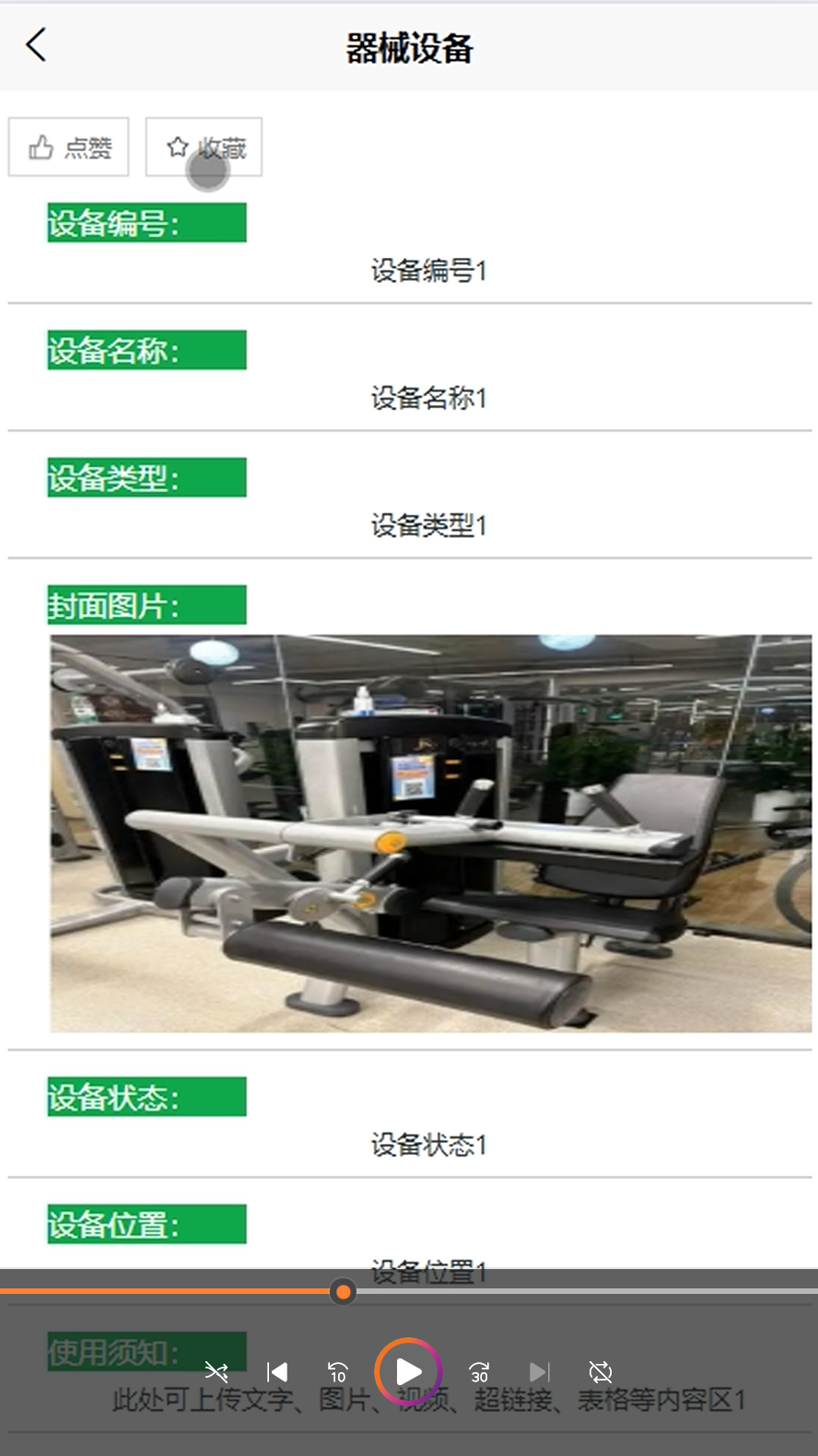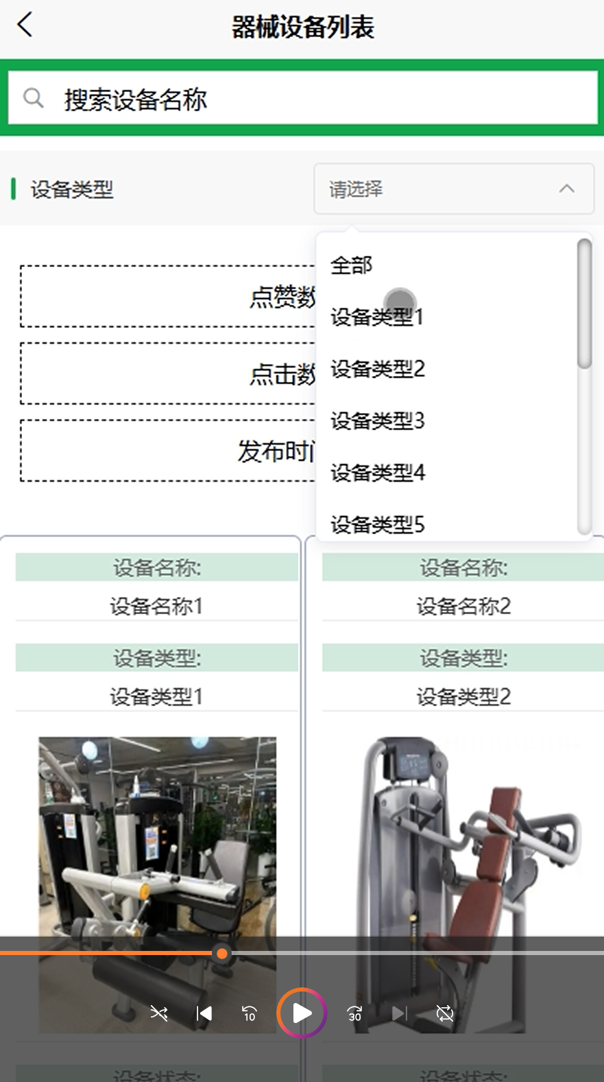 器械设备界面提供设备查询、查看详情和预约功能,用户可通过搜索设备名称或筛选设备类型查找目标设备,并查看点赞数、点击数及发布时间,了解设备的受欢迎程度和使用情况。设备详情包括设备编号、名称、类型、封面图片、状态、位置及使用须知,确保用户能够获取全面的信息。支持在线预约功能,用户可提前预定设备,并通过评论功能分享使用体验或提出反馈,提升健身房器械管理的互动性和用户体验。界面如下图所示。