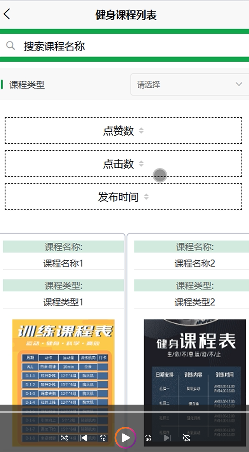 健身课程界面提供课程搜索、筛选和购买功能,用户可通过搜索课程名称或选择课程类型快速查找目标课程,并查看课程的点赞数、点击数及发布时间。课程信息包含封面图片、课程价格、授课教练、教练姓名和课程目标,帮助用户直观了解课程内容。用户可进入课程详情页面,查看详细介绍,并进行购买或评论互动,以提升健身体验和课程选择的精准度。界面如下图所示。