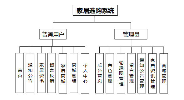 功能模块设计是系统开发过程中的重要阶段,将系统划分为不同的模块,每个模块负责完成特定的功能或任务。家居选购系统由多个功能模块组成,每个模块下又包含具体的功能操作。功能模块图如下图所示。