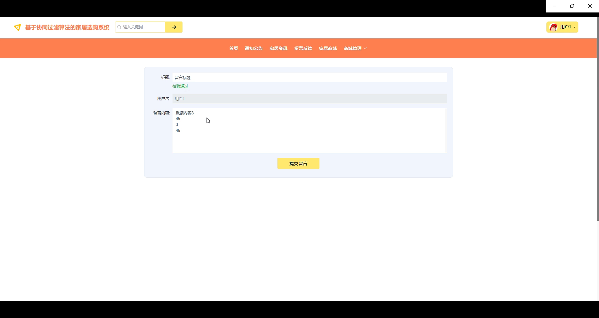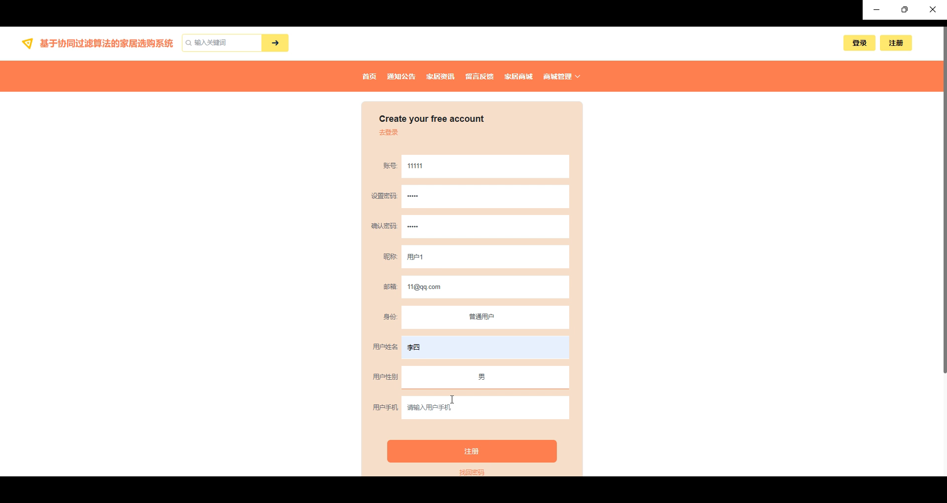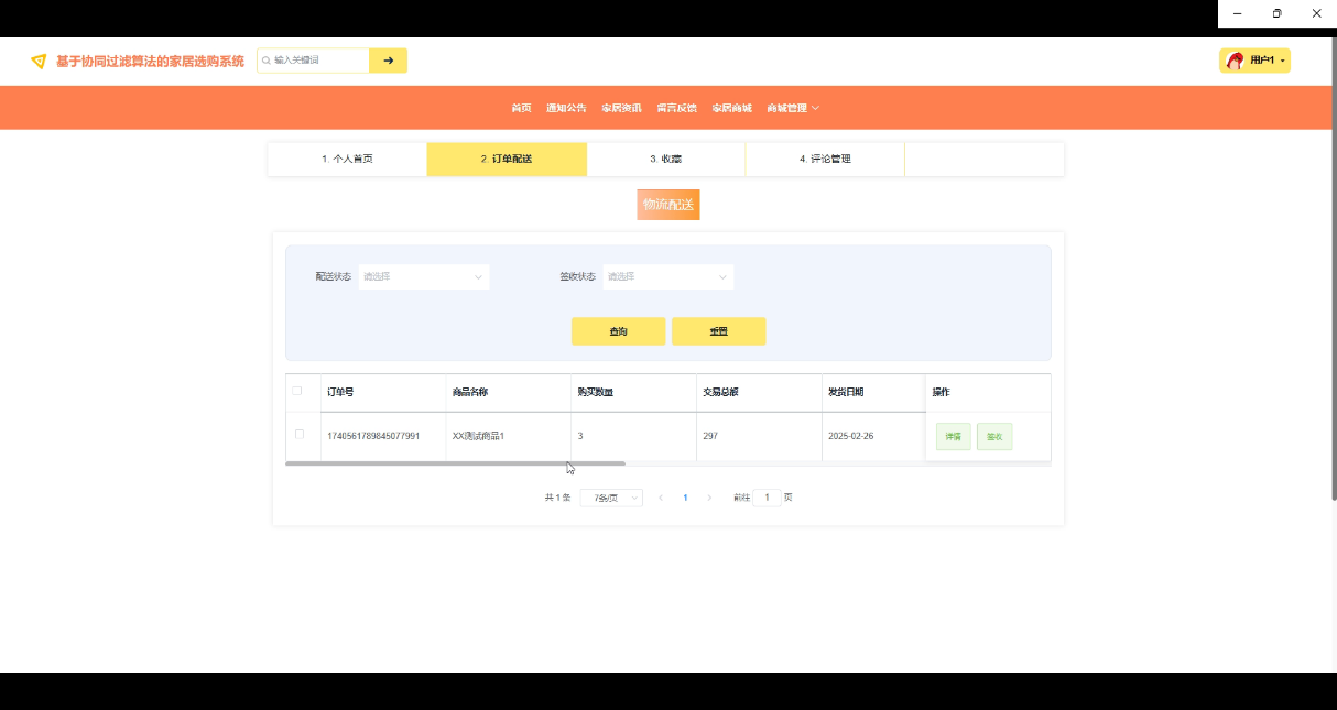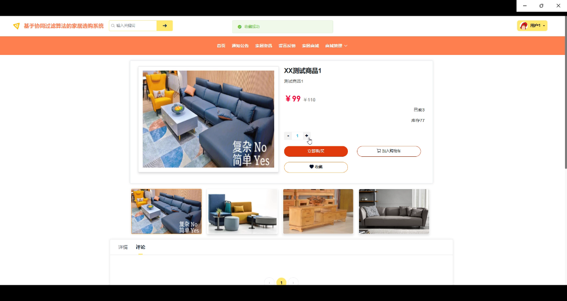 With the rapid development of Internet technology, online shopping has become an important part of people's daily life. As an important field in the consumer goods category, the home furnishing industry is gradually shifting its traditional offline sales model to online, and online home purchase systems have emerged. In order to enhance the shopping experience for users, the system adopts a collaborative filtering algorithm to recommend personalized home products to users by analyzing their historical behavior and purchasing preferences, thereby increasing their purchase conversion rate.