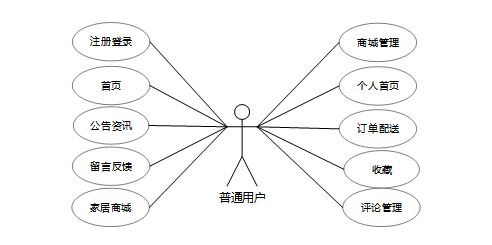普通用户可以通过首页的轮播图和个性化推荐功能获取最新的商品信息和促销活动。通过家居资讯模块,用户能了解家居设计趋势和购买建议。商城内提供商品搜索、浏览、购物车管理和结算功能,方便快捷地完成购买。此外,个人中心提供订单管理、配送跟踪和评论管理,提升用户体验。普通用户角色用例如下图所示。