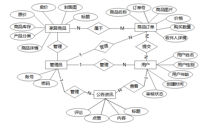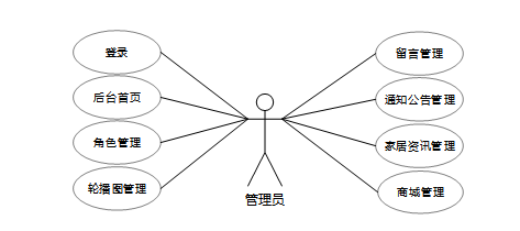 管理员通过后台首页查看商品销售数据和平台运营状况,快速访问常用管理功能。角色管理模块允许管理员设置用户权限,轮播图、留言和公告管理确保平台内容更新及时。家居资讯管理帮助管理员发布相关内容,商城管理功能支持商品管理、订单处理和配送跟踪,确保商城顺利运营。管理员角色用例如下图所示。