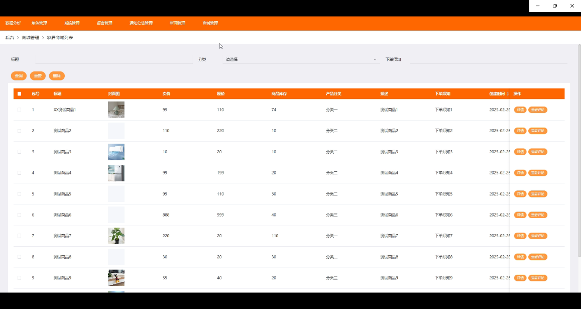 商城管理模块允许管理员管理平台的商品、分类、订单等核心内容。管理员可以在家居商城中新增、修改、删除商品,调整商品的价格、库存等信息。分类列表帮助管理员进行商品分类管理,确保商品信息的条理性和用户搜索的便捷性。订单列表功能允许管理员查看所有订单的状态,处理订单中的问题。订单配送模块则帮助管理员实时跟踪订单的配送进度,确保商品按时送达,提升用户体验和平台效率。界面如下所示。