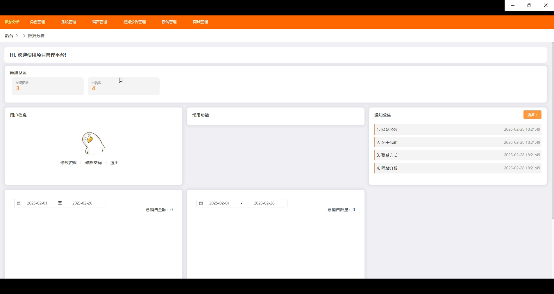 后台首页展示了平台的实时数据,包括商品销售数量、销售金额、用户活跃度等重要指标。通过数据分析图,管理员可以清晰地了解平台运营状况,进行实时监控和决策。常用功能区提供快捷入口,包括订单管理、商品管理、用户管理等,方便管理员高效操作。界面如下所示。