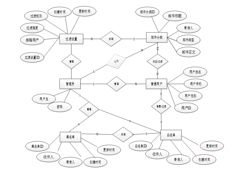 Django垃圾邮件分类器系统中停车场管理员、邮箱用户、邮件分类、过滤设置、黑名单、白名单等E-R实体关系图。