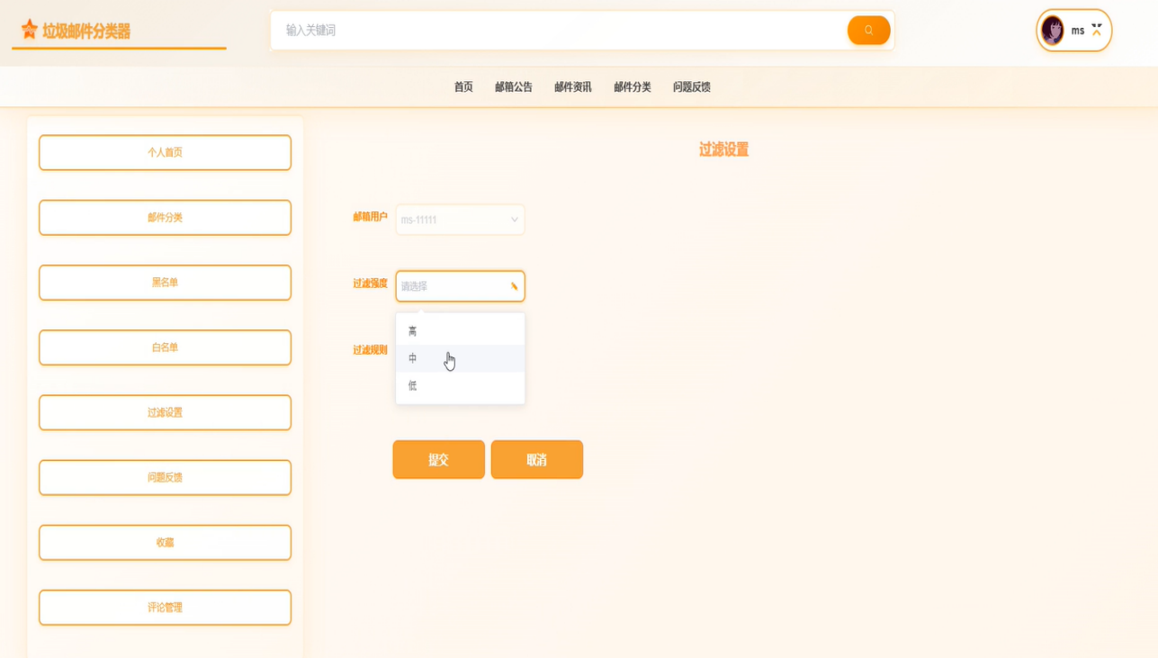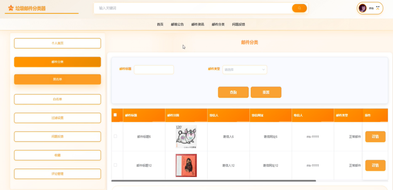 个人中心:包含个人首页、邮件分类、黑名单、白名单、过滤设置、问题反馈、收藏、评论管理等的功能,邮件分类:主要展示该用户邮件分类信息。黑名单:主要展示该用户黑名单邮件信息。白名单:主要展示该用户的白名单信息。过滤设置:用户可在该功能对邮件进行过滤强调和过滤规则进行设置。问题反馈:主要展示用户提交反馈和建议记录。收藏:用户可收藏自己感兴趣的邮件信息到自己的收藏夹,方便日后自己查看。评论管理:用户可查看系统评论信息和交流心得注意事项等功能。邮件分类如图5-5所示。过滤设置如图5-6所示。