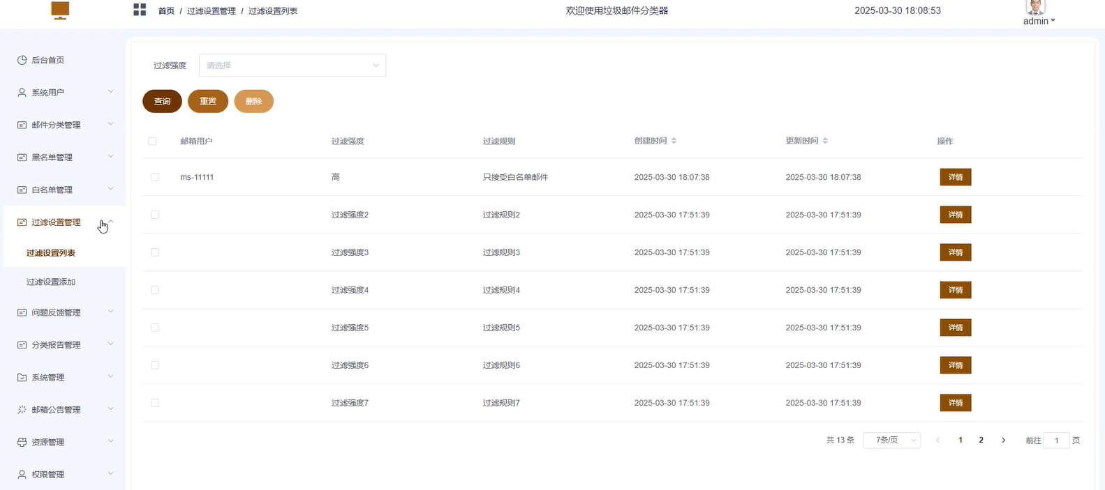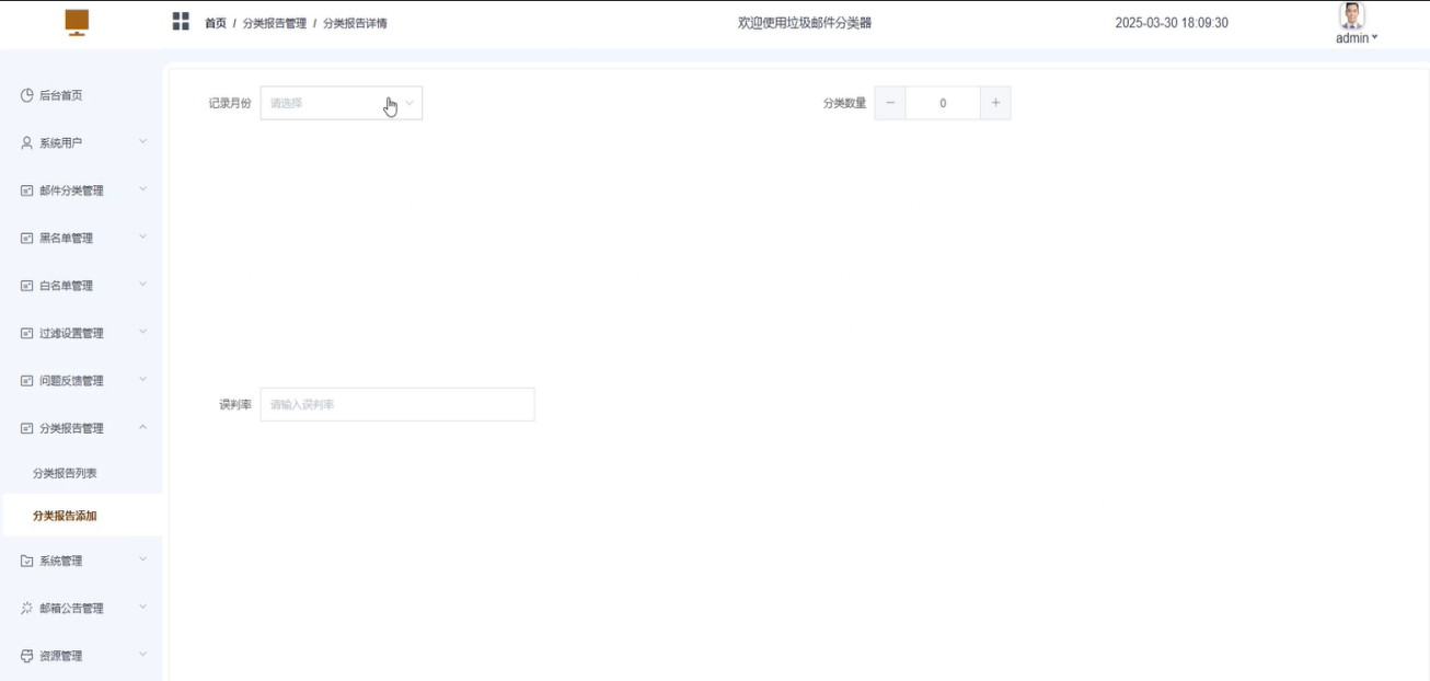 (2)邮件分类管理:包含邮件分类列表和邮件分类添加功能。邮件分类列表:展示所有用户的邮件分类信息,可进行增删改查等操作。邮件分类添加:可手动添加邮件分类信息。.