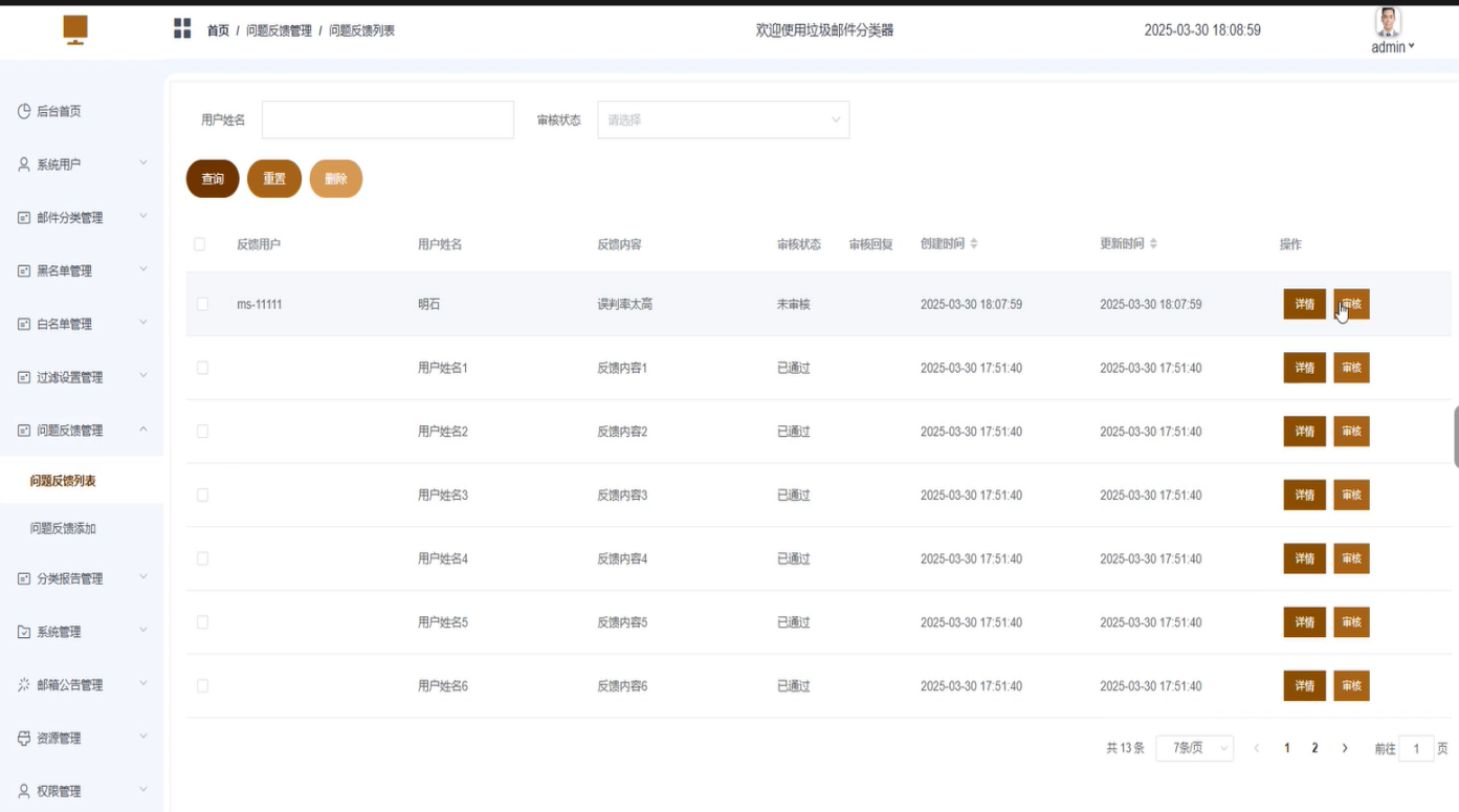 (6)问题反馈管理:展示所有用户提交的反馈和建议信息,管理员并对用户提出的反馈和建议进行处理。