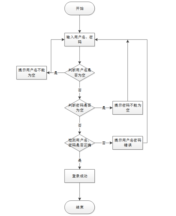 所有用户登录系统需要前端校验用户名、密码是否正确以及是否为空,具体流程图如图所示: