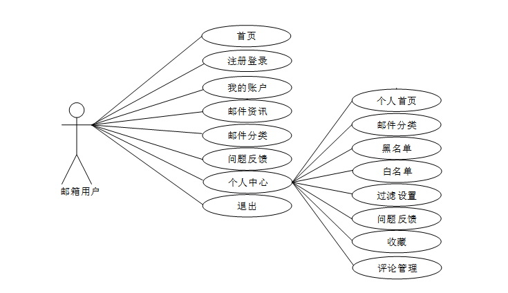 Django垃圾邮件分类器系统中注册邮箱用户包含注册、登录、首页、邮件资讯、邮件分类、问题反馈、个人中心等功能模块,对应角色用例图如图3.1所示: