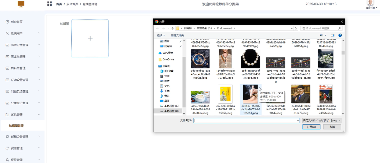 (8)系统管理:主要是轮播图管理:管理员可以管理平台首页的轮播图内容,提供宣传和推广信息,可进行查询、添加、删除、重置详情等操作。添加的轮播图可在前台首页展示。