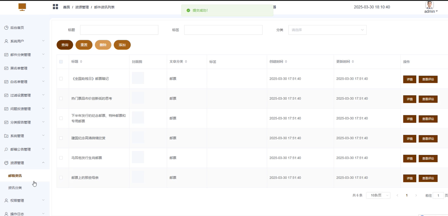 (10)资源管理:包含邮箱资讯信息、资讯分类等功能,邮箱资讯信息:管理员可查看邮箱资讯信息,可进行增删改查等操作。资讯分类:管理员可添加资讯分类信息,添加的信息都可在前台展示。