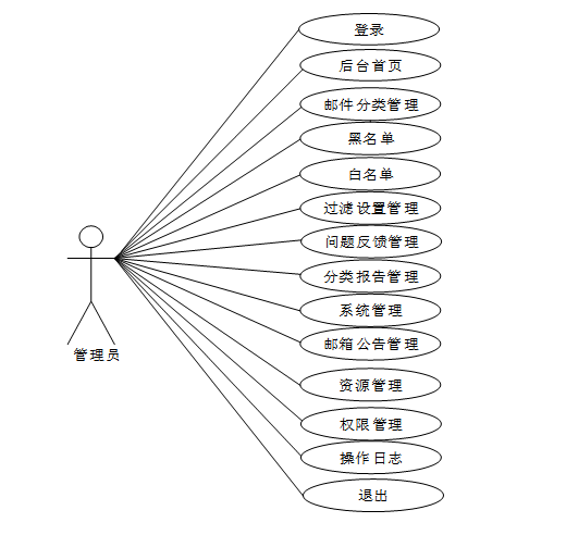 Django垃圾邮件分类器系统中管理员包含登录、后台首页、邮件分类管理、黑名单管理、白名单管理、过滤设置信息管理、问题反馈管理、分类报告管理、系统管理、邮箱公告管理、资源管理、权限管理、操作日志等功能模块,对应角色用例图如图3.2所示: