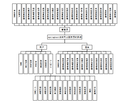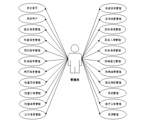 管理员的功能有:后台首页、系统用户、医生信息管理、科室信息管理、预约挂号管理、取消挂号管理、病历信息管理、检查项目管理、检查订单管理、检查结果管理、处方信息管理、在线咨询管理、咨询回复管理、药品信息管理、药品入库管理、财务信息管理、报销登记管理、报销结果管理、医生排班管理、系统管理、医疗公告管理、资源管理。