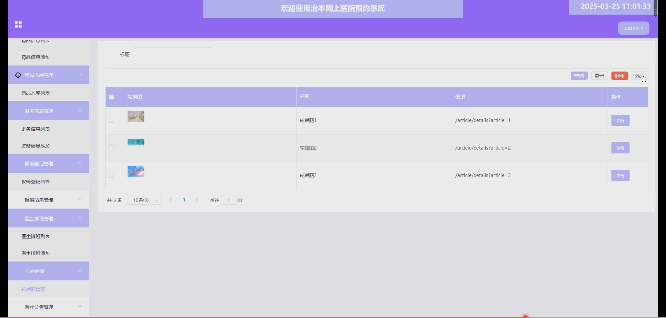 管理员进入系统管理页面,查看所有轮播图信息,添加新的轮播图。系统管理界面如图5-13所示。