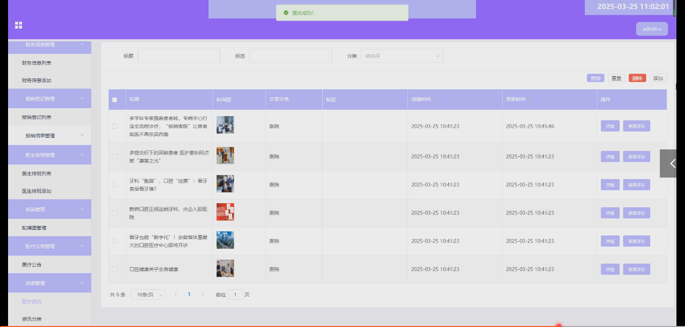 管理员在资源管理页面查看所有医疗资讯详情,支持查询、重置、删除、添加操作。资源管理界面如图5-14所示。