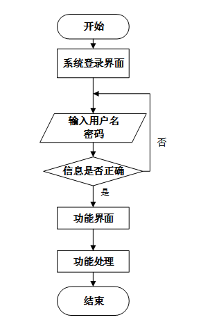用户首先进入系统登录界面,输入用户名和密码后,系统验证信息是否正确。若验证失败,返回登录界面重新输入;若验证成功,则进入功能界面,执行相应功能处理后结束操作流程。操作流程如图3-5所示。