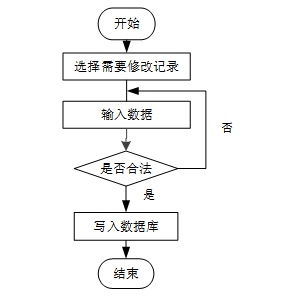 用户首先选择需要修改的记录,输入修改后的数据,系统判断输入数据是否合法。若数据不合法,提示重新输入;若数据合法,则将修改后的数据写入数据库,完成操作后流程结束。修改信息流程图如图3-7所示。