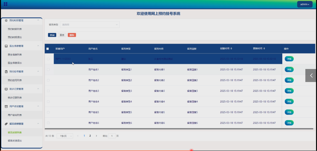 管理员在留言反馈管理页面查看所有留言反馈列表,支持查询、重置和删除操作。留言反馈管理界面如图5-12所示。