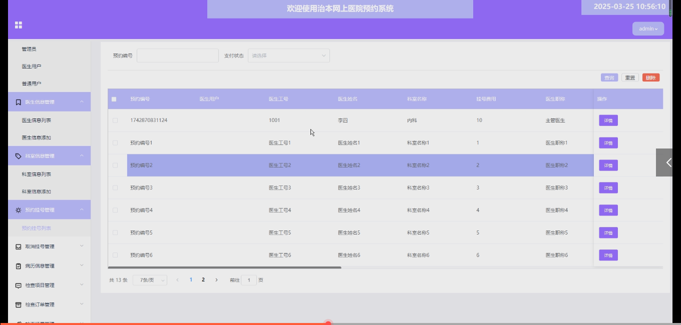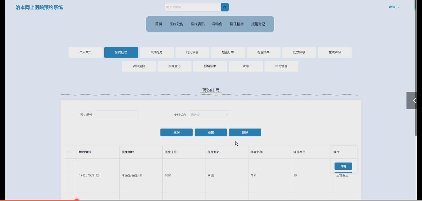 管理员进入预约挂号管理页面查看预约挂号信息,支持重置、查询和删除操作。预约挂号管理界面如图5-11所示。