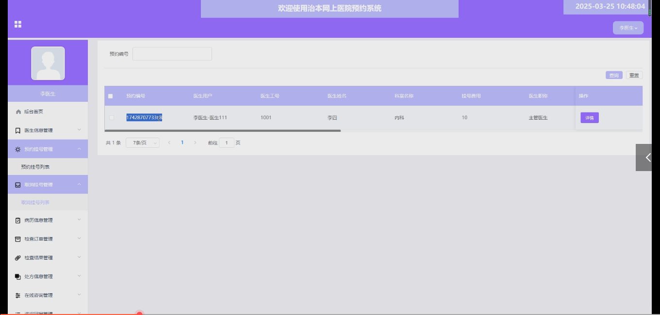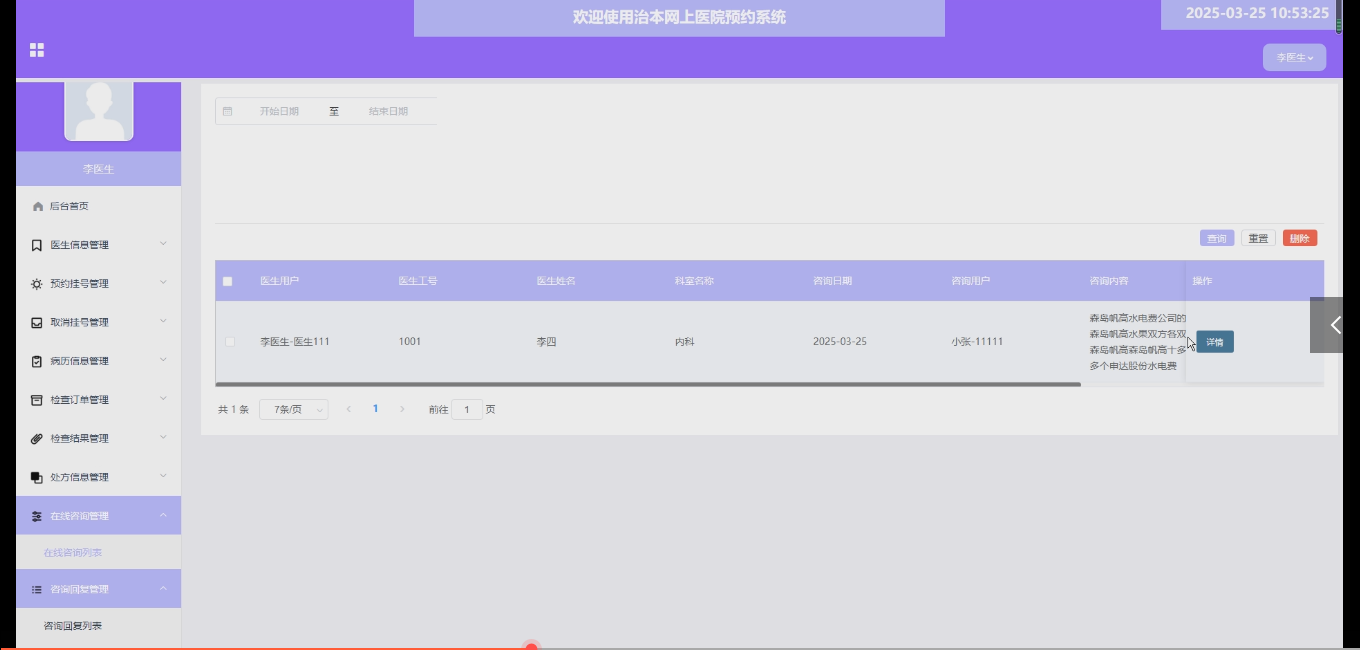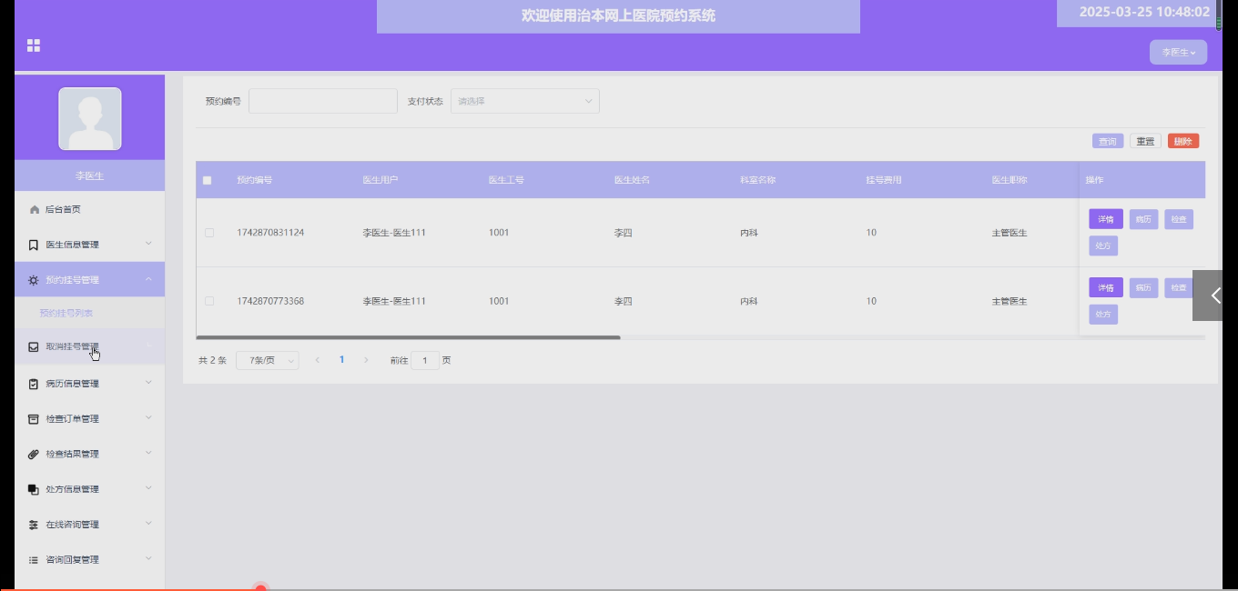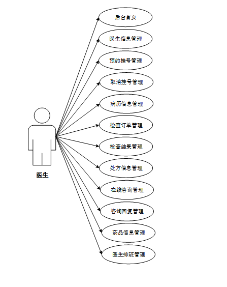 医生的功能有:后台首页、医生信息管理、预约挂号管理、取消挂号管理、病历信息管理、检查订单管理、检查结果管理、处方信息管理、在线咨询管理、咨询回复管理、药品信息管理、医生排班管理。