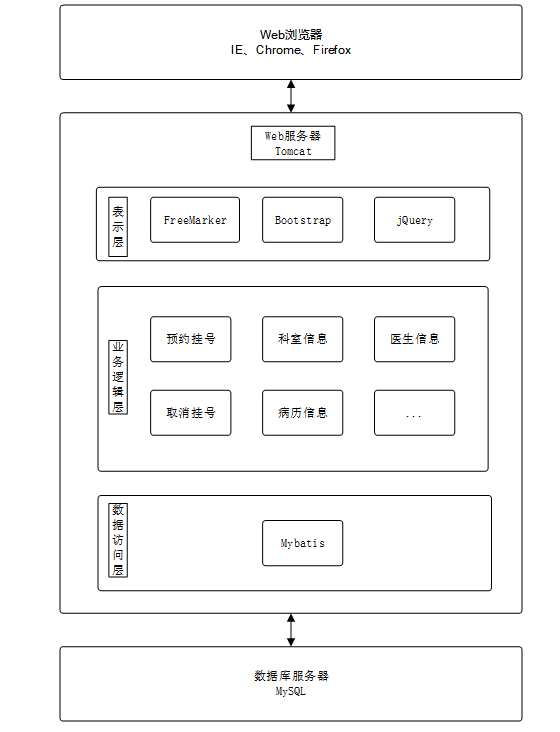 系统由表现层、业务逻辑层、数据访问层和数据库服务器组成。表现层通过浏览器(如IE、Chrome、Firefox)与用户交互,采用FreeMarker、Bootstrap、jQuery等技术实现界面呈现。业务逻辑层负责处理系统的核心业务逻辑,通过分模块设计实现功能分离。数据访问层使用MyBatis框架连接数据库,执行数据的增删改查操作。数据库服务器采用MySQL进行数据存储和管理,为系统提供稳定的数据库支持。整个架构通过Tomcat服务器完成用户请求的接收和处理,确保系统的高效运行[8]。整个系统架构如图4-1所示。