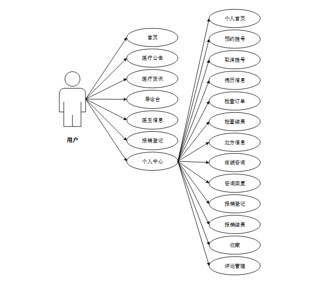 用户的主要功能有:首页、医疗公告、医疗资讯、导诊台、医生信息、报销登记、个人中心(个人首页、预约挂号、取消挂号、病历信息、检查订单、检查结果、处方信息、在线咨询、咨询回复、报销登记、报销结果、收藏、评论管理)。