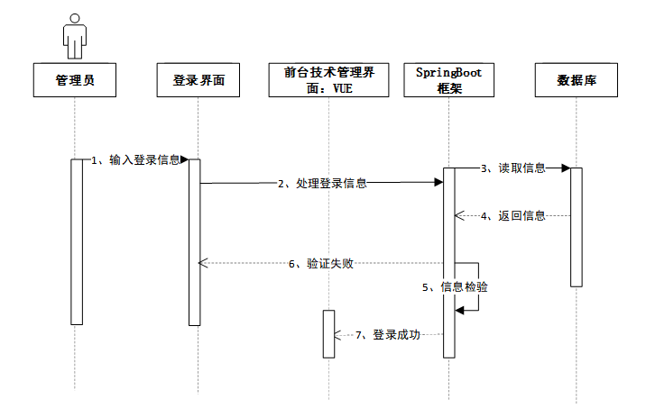 管理员输入登录信息后,登录界面将信息传递至前台管理界面,随后通过SpringBoot框架读取数据库中的用户信息并返回。系统验证信息,若验证成功则登录成功,若验证失败则返回错误提示。登录时序图如图4-4所示。