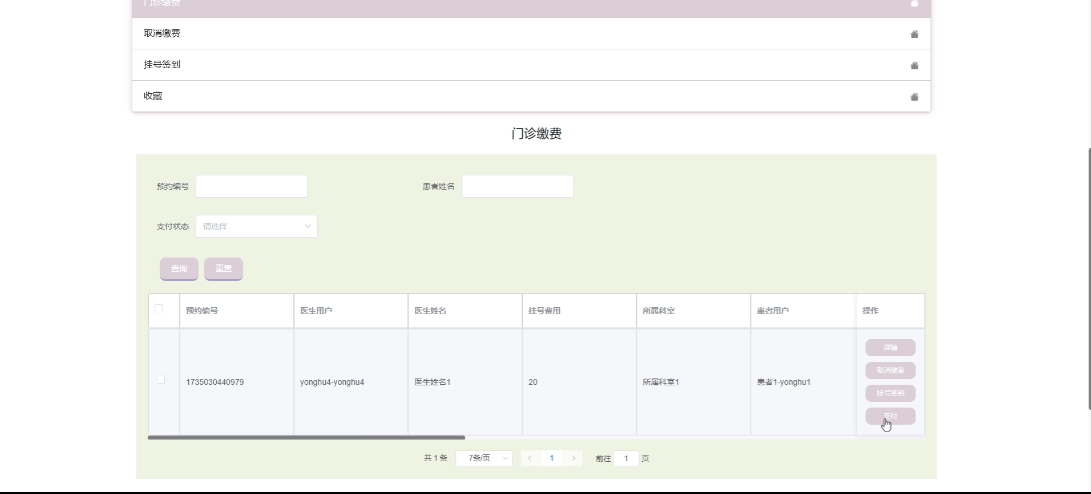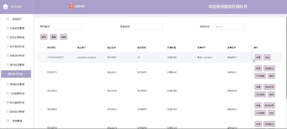 预约挂号管理:管理员可以处理所有的预约挂号信息,支持查询、更新、审核及删除预约挂号,实现取消缴费、挂号签到及支付等操作。