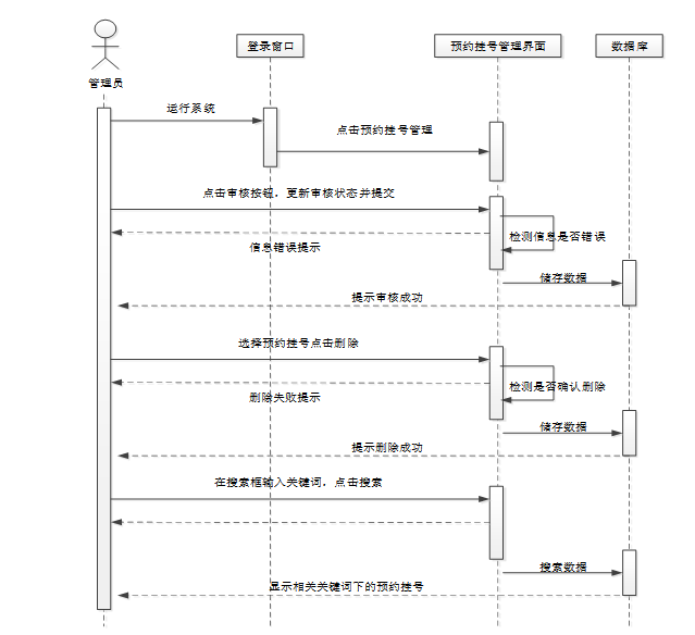 预约挂号管理用例允许管理员或医生用户登录系统后审核患者提交的预约挂号申请,更新审核状态, 预约挂号管理用例的用例规约如表3-4所示。