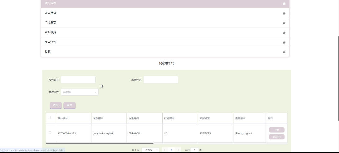 预约挂号:展示患者用户的预约挂号信息,支持查询和查看信息内容,确认审核状态,提供取消挂号操作。