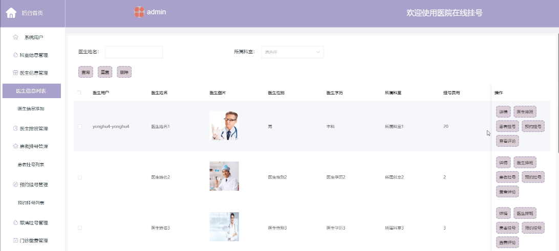 医生信息管理:管理员可以管理所有的医生信息,支持发布新的医生信息,修改和删除现有的医生信息,并可查看相关评论,提供医生排班、患者挂号、预约挂号操作。
