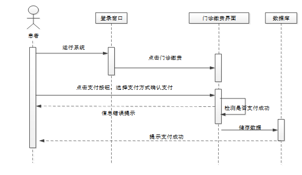 | 1 | 门诊缴费 | 用户选择一个未缴费项目并成功支付 | 系统生成缴费订单,并更新缴费项目状态为“已支付”,发送电子缴费凭证给用户 |