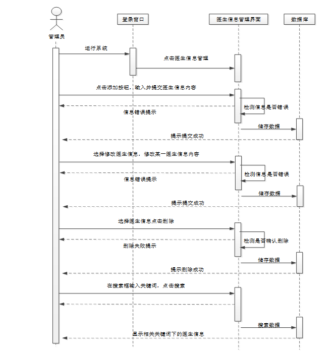 | 备选流 | 1. 信息不完整:系统提示补充所需字段; 2. 删除医生信息失败:存在依赖关系时需先处理相关预约等; 3. 网络异常:尽量保存进度并在网络恢复后提示继续。 |