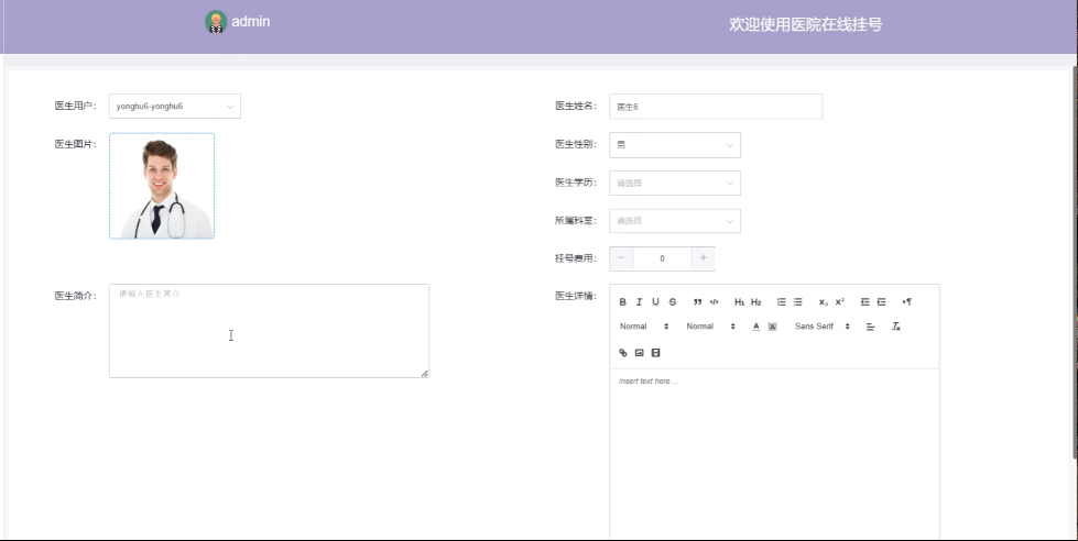 - 医生信息管理:系统允许管理员添加、编辑或删除医生信息,支持排班设置,便于患者选择合适的医生进行预约,提升医疗服务的质量。