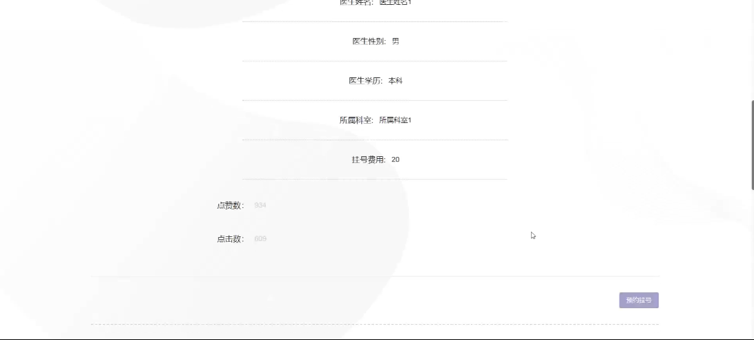 医生信息:展示发布的所有医生信息,支持搜索和浏览详情,并可点赞、收藏医生信息,发表评论内容,提供预约挂号功能。