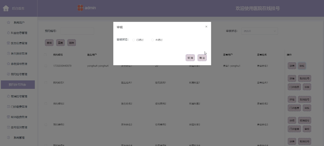 管理员可以通过后台管理系统使用`AdminService`提供的功能对所有预约进行审核与管理,更新审核预约挂号信息(例如从“未通过”到“通过”),并通过调用`updateAppointmentStatus`同步通知相关患者和医生。界面如下图所示。