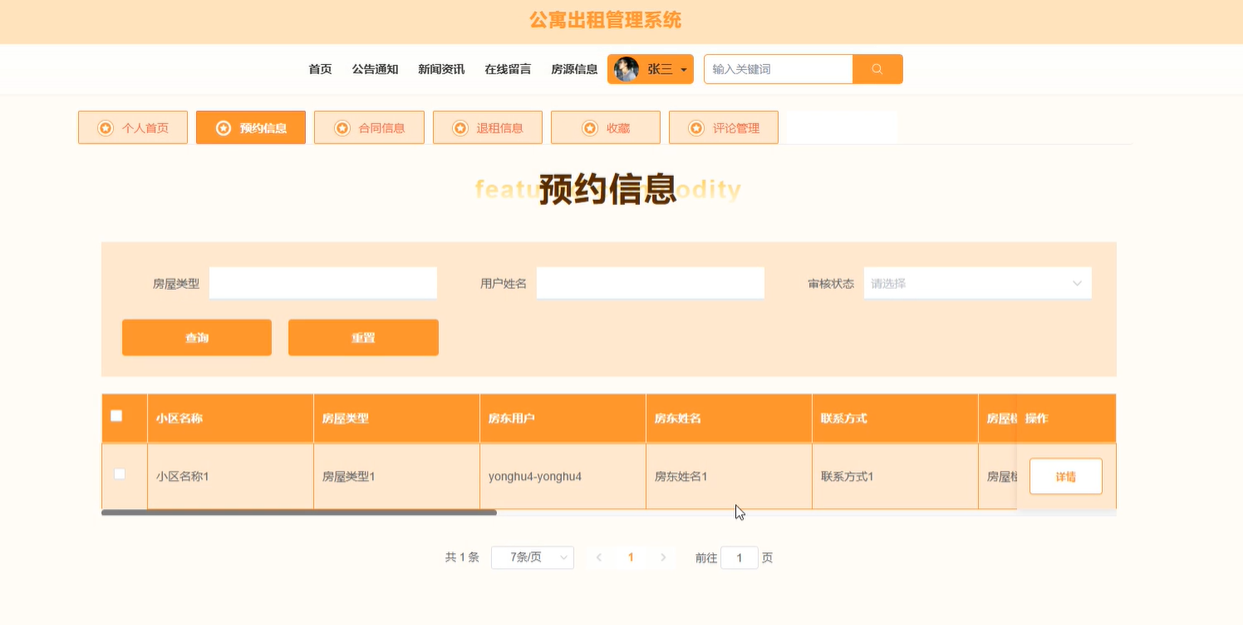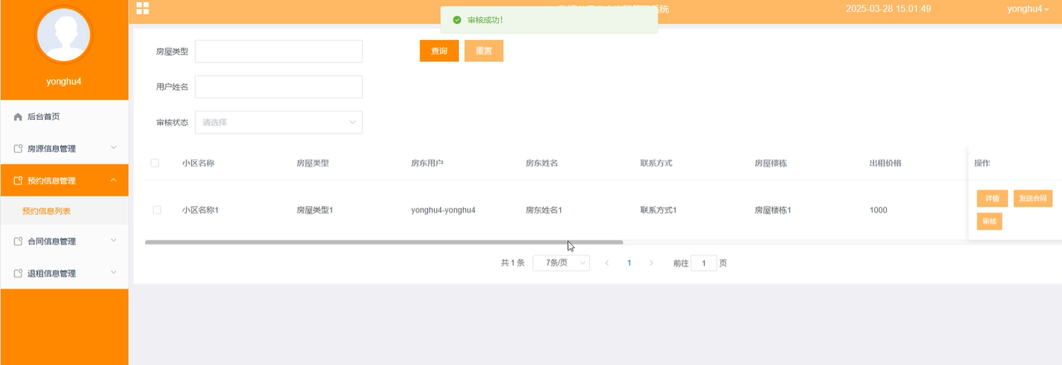 (5)预约信息管理:主要管理所有房东租客的预约信息,并审核预约信息,审核完毕发送合同信息给租客审阅签订。包括查询、修改等操作。