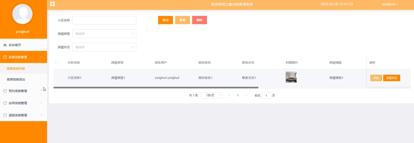 The apartment rental management system based on SpringBoot aims to solve the problems of information management confusion, high error rate, poor information security, and high labor intensity in traditional apartment rental management methods. The system adopts B/S architecture, with a visual and dynamic user interface built using Vue technology on the front end, and a backend developed using the SpringBoot framework, which utilizes its features such as simplified configuration, automatic configuration, and embedded containers to improve development efficiency and reduce maintenance costs. The database is MySQL, which meets the needs of the apartment rental system for data storage and query. The system functions include user management, housing information management, reservation information management, contract information management, and lease termination management. The user management module ensures the accuracy and security of user information; The housing resource information management module makes housing resource information management convenient and efficient; The reservation information management module simplifies the leasing process and improves leasing efficiency; The online message module enhances system interactivity and user experience; The system has undergone rigorous testing to meet the basic business needs of house rental, providing users with convenient services and administrators with efficient management tools to promote the healthy development of the house rental market.
