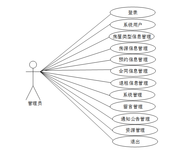 SpringBoot的公寓出租管理系统的设计与实现中企业用涉及登录、系统用户、房屋类型信息管理、房源信息管理、预约信息管理、合同信息管理、退租信息管理、系统管理、留言管理、通知公告管理、资源管理等,管理员用对应例图如图3.3所示。