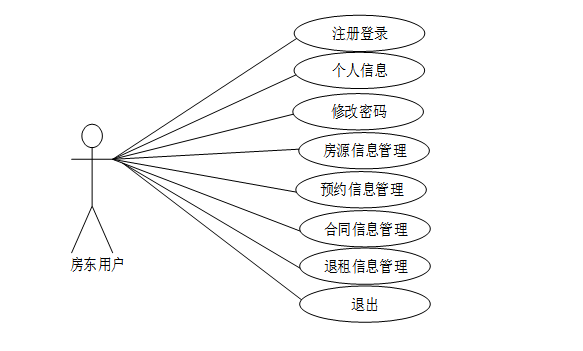 SpringBoot的公寓出租管理系统的设计与实现中房东用户涉及登录、个人信息、修改密码、房源信息管理、预约信息管理、合同信息管理、退租信息管理等,房东用户用对应例图如图3.2所示。