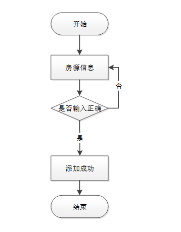 添加房源信息,输入医生姓名、小区名称、房屋类型、房屋面积等信息,并校验输入是否正确,房源信息添加流程图,如图所示:
