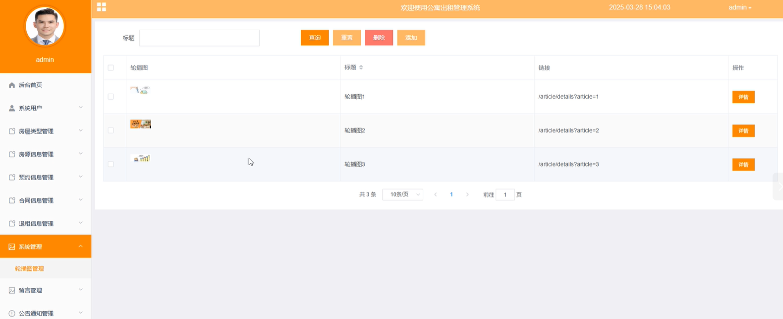 (8)系统管理:管理员可以管理平台首页的轮播图内容,提供宣传和推广信息,吸引更多用户浏览。可进行查看详情、修改等操作。修改的轮播图可在前台首页展示。
