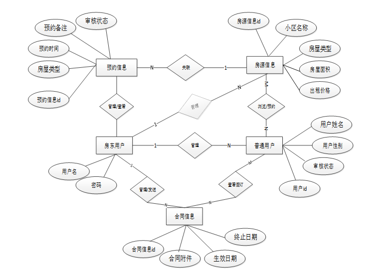 SpringBoot的公寓出租管理系统的设计与实现系统网站中房东用户、普通用户、房源信息、预约信息、合同信息等E-R实体关系图。