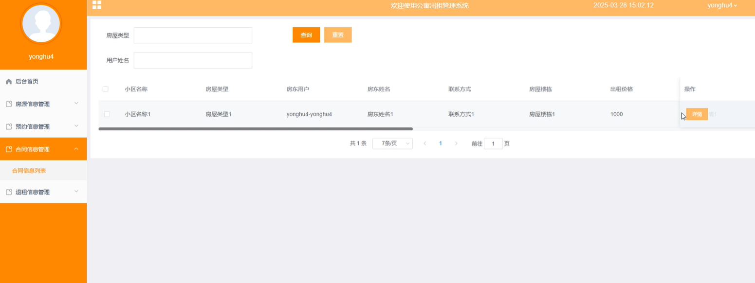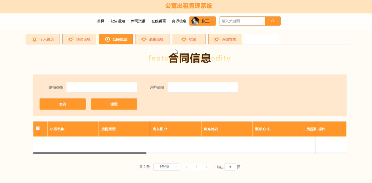 (6)合同信息管理:主要管理所有房东的合同信息。包括查询、修改等操作。