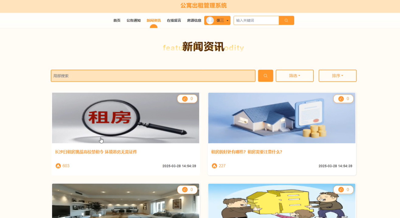 新闻资讯:查看房屋租赁相关新闻资讯。可筛选搜索、排序搜索、局部搜索,点击信息可发表评论、点赞、收藏等操作。新闻资讯如图5-3所示。